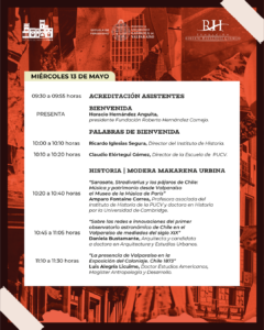 La primera mesa, dedicada a la Historia, estará moderada por Makarena Urbina y se articulará en torno a diversas miradas sobre Valparaíso como espacio cultural e intelectual. Participarán Amparo Fontaine Correa, con una investigación sobre música y patrimonio entre Valparaíso y el Museo de la Música de París; Daniela Bustamante Canales, candidata a doctorado, quien abordará las redes e innovaciones del primer observatorio astronómico de Chile en el Valparaíso del siglo XIX; y Luis Alegría Licuime, investigador del Servicio Nacional del Patrimonio Cultural, con una ponencia sobre la presencia de Valparaíso en la Exposición del Coloniaje de 1873.