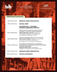 La mesa de Patrimonio, moderada por Andrea Hermans Zúñiga, reúne investigaciones cuyo eje principal son los archivos y acervos museales como fuentes de conocimiento. Expondrán Thalía Valdenegro Huircán, sobre prácticas y desafíos en el Archivo Myriam Waisberg; Leslie Azócar Poblete, recientemente egresada de magíster, con una investigación sobre el retrato de Gabriela Mistral realizado por Nina Anguita; y Alejandra Didier Pérez, quien presentará un estudio sobre prostitución y control social a través de los archivos municipales de Quillota entre 1900 y 1930.